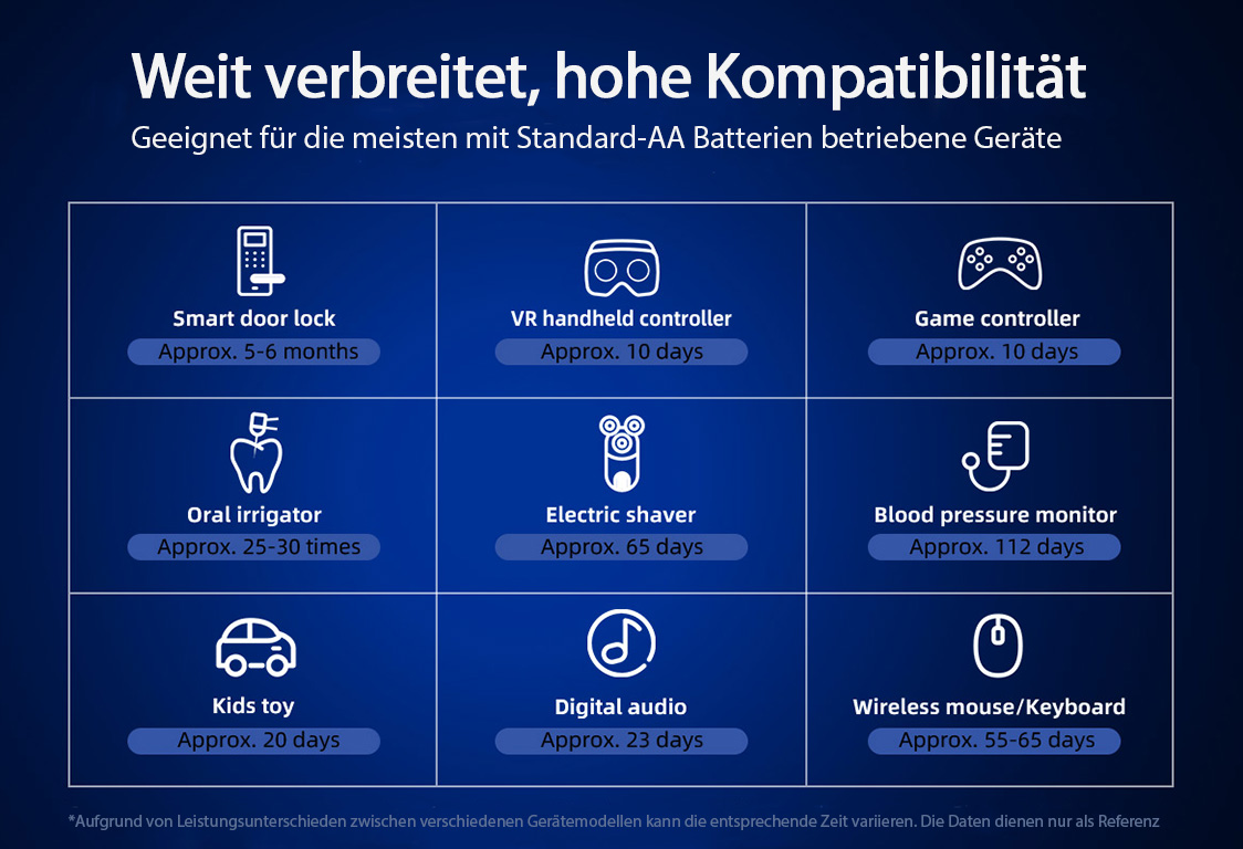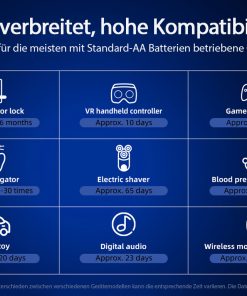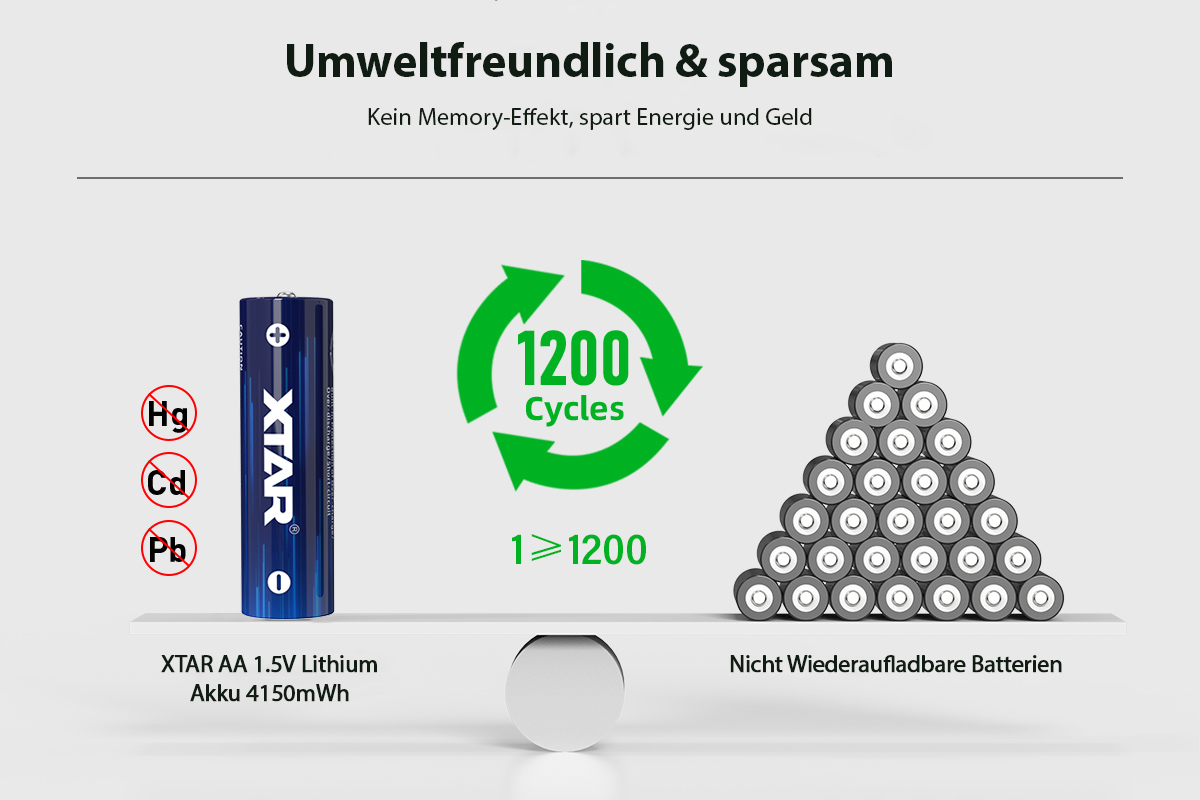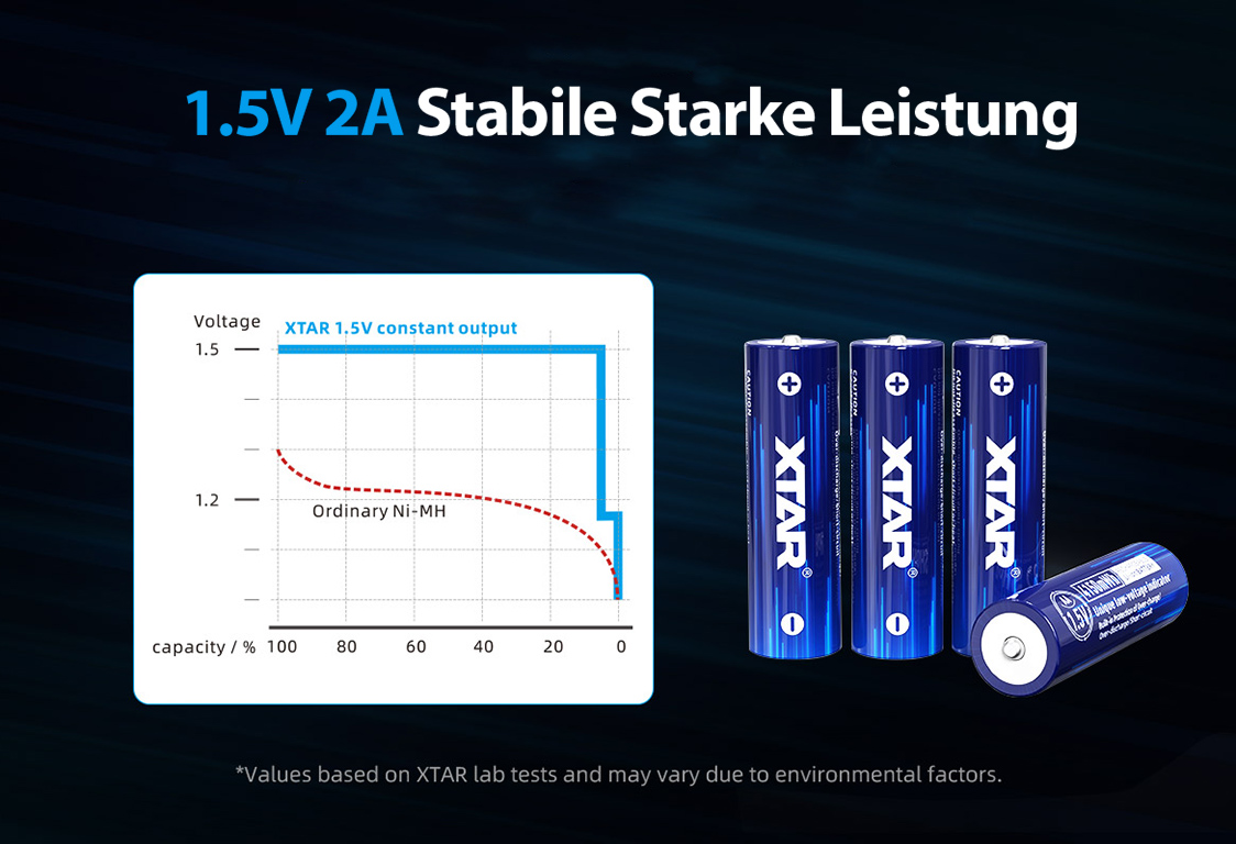 Funkcionalnost: S konstantno izhodno napetostjo 1,5 volta te litij-ionske baterije, ki imajo pogosto uporabljen indikator AAA/AA, revolucionirajo mobilno napajanje za številne standardne aplikacije. Indikator omogoča napravam (s funkcijo indikatorja nizke porabe), da uporabnika pravočasno opozorijo, ko je baterija skoraj prazna.